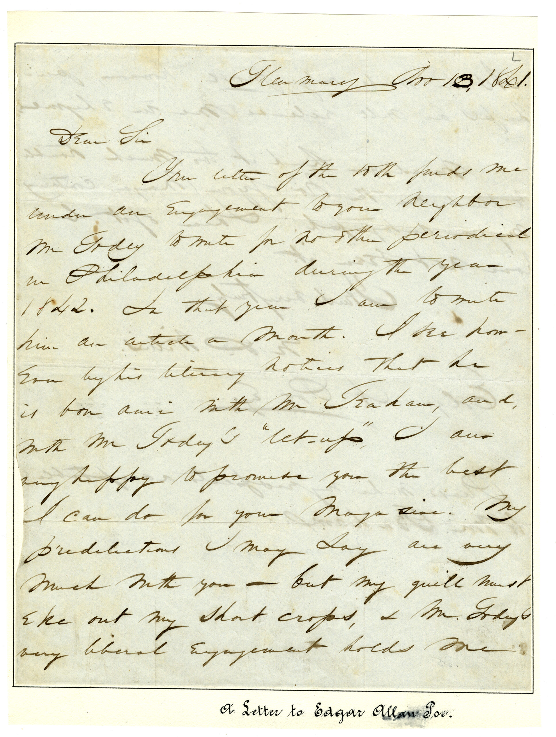 This handwritten letter, dated October 13, 1842, was written by Nathaniel Parker Willis and addressed to Edgar Allan Poe. Composed from Glenmary, the letter documents a moment of active professional correspondence between editor and author during a formative period in Poe’s literary career.