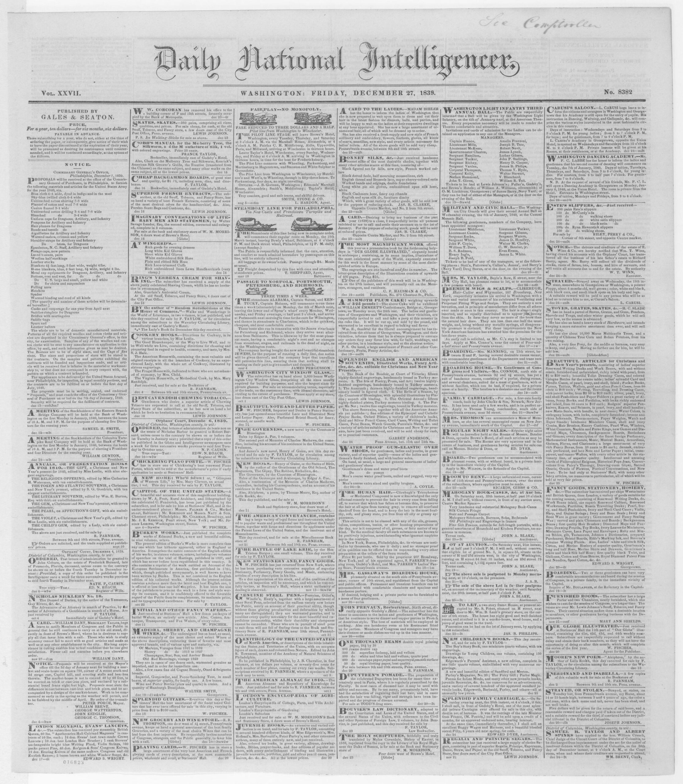 Front page of the Daily National Intelligencer, Washington, D.C., Friday, December 27, 1839. Source: Library of Congress, Chronicling America (LCCN: sn83026172). Public domain.