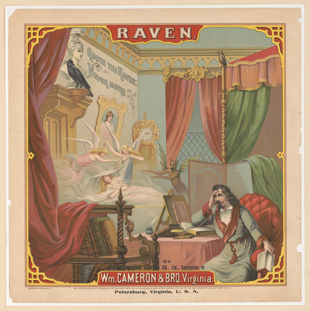 What makes this image remarkable is its purpose. Created as a commercial print—likely tied to tobacco marketing—it uses literature not as ornament, but as emotional shorthand. By the 1870s, Poe’s raven was already universally recognizable. No explanation was needed. One line, one bird, and an entire emotional landscape snapped into place.